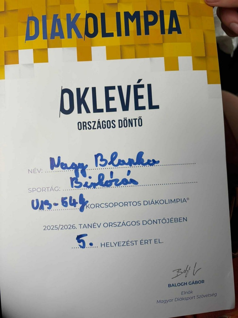 Nagy Blanka, iskolánk 6. osztályos tanulója a Miskolcon szervezett U13 női birkózás Diákolimpia Országos Döntőjén vett részt, ahol 5. helyezést ért el.